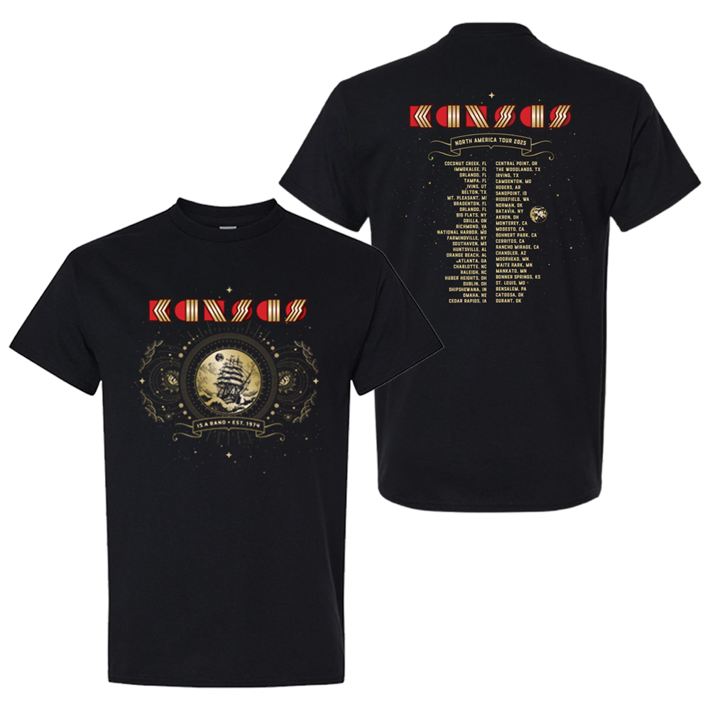 Black t-shirt with the 2025 Kansas Is A Band · Est. 1974 design printed on the front and 2025 tour dates on the back